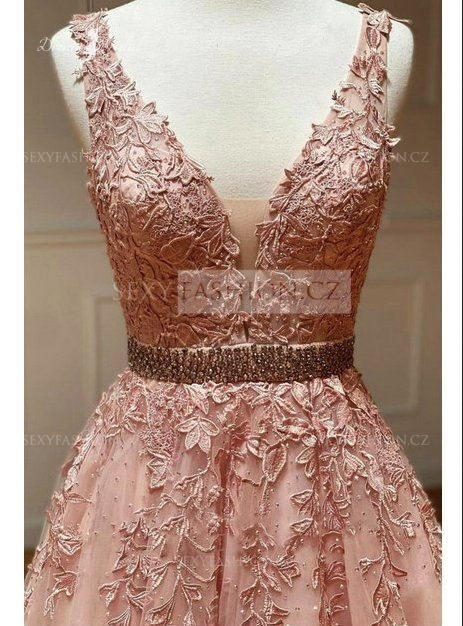 Donna Bridal Luxusní plesové & společenské šaty s krajkou, kamínky a šněrováním na zádech – ball gown silueta Růžová světlá Velikost 34 kód 154
