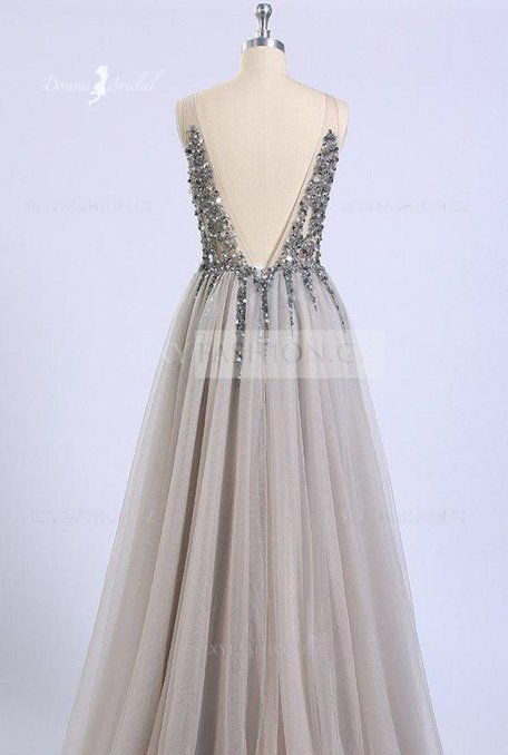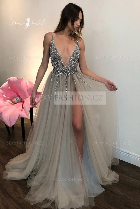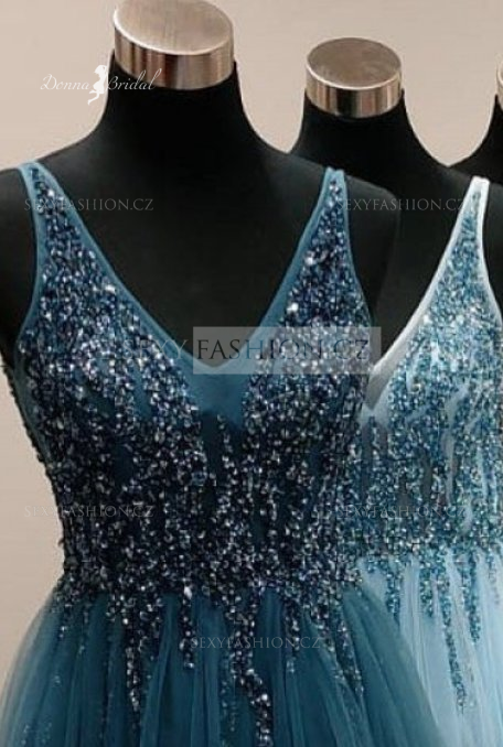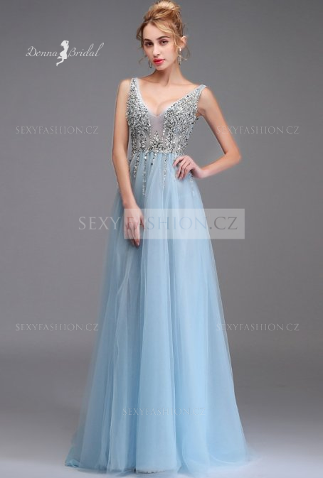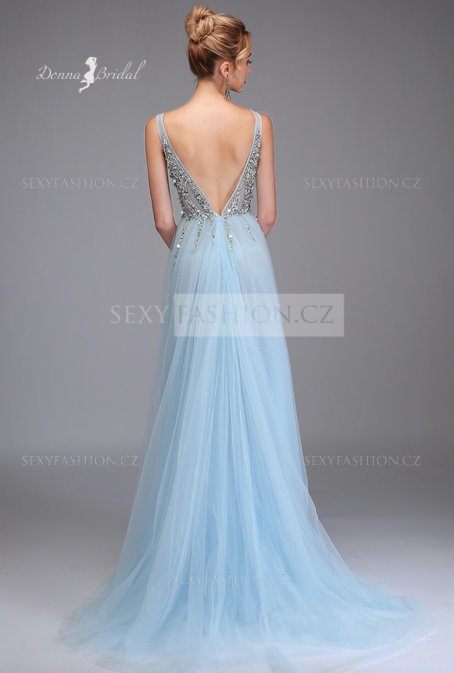 Donna Bridal večerní, krásné a sexy společenské šaty s rozparkem a výstřihem do V Modrá nebeská Velikost 32 kód 363